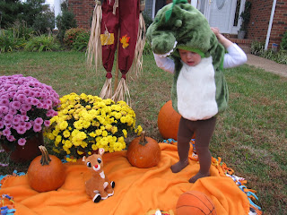 Yeah, so as you can see, it went a little bit better when he was just 4 1/2 months, as opposed to the 17 month old that he was this Halloween!! First of all, he absolutely hated his costume with every inch of his being. He CANNOT stand things on his head and I'm sooo hoping this is just a phase! He will barely even let me comb his hair, let alone get a haircut, and then of course tolerating that big dragon or dinosaur or whatever head thang all perched up on his head! He kept yanking it right off. So, noone could even tell what he was for Halloween. And notice his brown opaque tights. Those are the ones he wore last year and I just stuck them on him for this photoshoot and realized immediately they were way too small! You can definitely tell cuz of the stretchy stuff at the top that I don't think you're supposed to see. :)